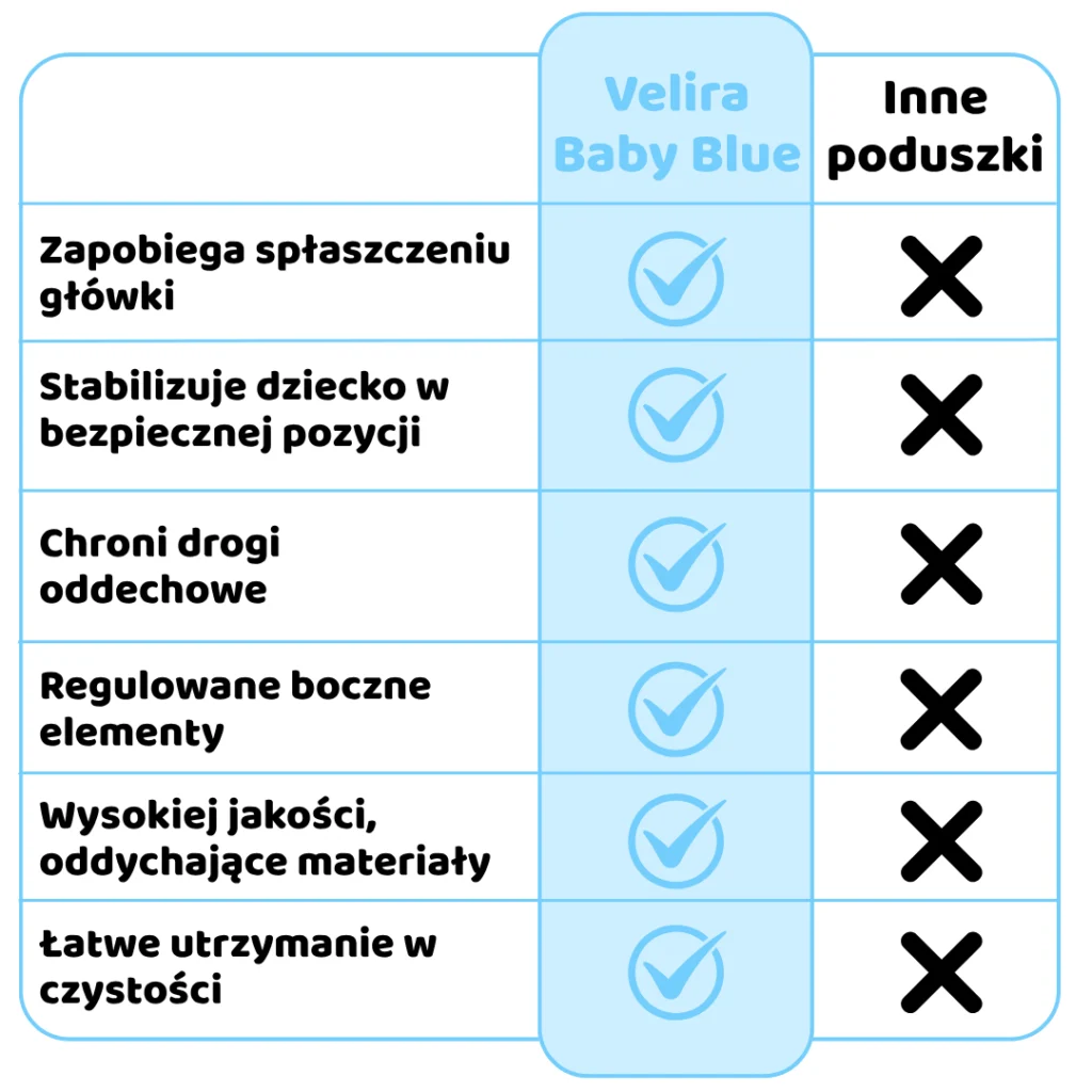 🛌 Poduszka Velira Baby Blue posiada regulowane boczne elementy, które ograniczają niekontrolowane ruchy główki dziecka i utrzymują ją w prawidłowej pozycji podczas snu, zapobiegając deformacjom czaszki!